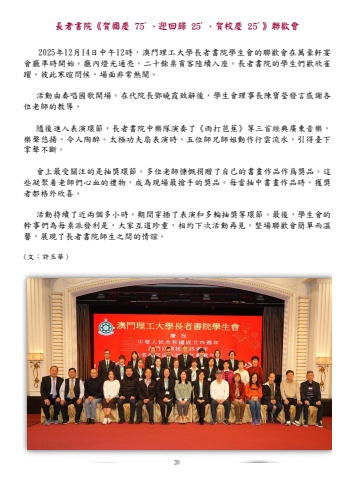 %u9577%u8005%u66f8%u9662%u300a%u8cc0%u570b%u6176 75'%u3001%u8fce%u56de%u6b78 25'%u3001%u8cc0%u6821%u6176 25'%u300b%u806f%u6b61%u67032025%u5e7412%u670814%u65e5%u4e2d%u534812%u6642%uff0c%u6fb3%u9580%u7406%u5de5%u5927%u5b78%u9577%u8005%u66f8%u9662%u5b78%u751f%u6703%u7684%u806f%u6b61%u6703%u5728%u842c%u8c6a%u8ed2%u5bb4%u6703%u5ef3%u6e96%u6642%u958b%u59cb%u3002%u5ef3%u5167%u71c8%u5149%u901a%u4eae%uff0c%u4e8c%u5341%u9918%u684c%u8cd3%u5ba2%u9678%u7e8c%u5165%u5ea7%u3002%u9577%u8005%u66f8%u9662%u7684%u5b78%u751f%u5011%u6b61%u6b23%u96c0%u8e8d%uff0c%u5f7c%u6b64%u5bd2%u6684%u554f%u5019%uff0c%u5834%u9762%u975e%u5e38%u71b1%u9b27%u3002%u6d3b%u52d5%u7531%u594f%u5531%u570b%u6b4c%u958b%u5834%u3002%u5728%u4ee3%u9662%u9577%u9127%u66c9%u971e%u81f4%u8fad%u5f8c%uff0c%u5b78%u751f%u6703%u7406%u4e8b%u9577%u9673%u5bf6%u7469%u767c%u8a00%u611f%u8b1d%u5404%u4f4d%u8001%u5e2b%u7684%u6559%u5c0e%u3002%u96a8%u5f8c%u9032%u5165%u8868%u6f14%u74b0%u7bc0%uff0c%u9577%u8005%u66f8%u9662%u4e2d%u6a02%u968a%u6f14%u594f%u4e86%u300a%u96e8%u6253%u82ad%u8549%u300b%u7b49%u4e09%u9996%u7d93%u5178%u5ee3%u6771%u97f3%u6a02%uff0c%u6a02%u8072%u60a0%u63da%uff0c%u4ee4%u4eba%u9676%u9189%u3002%u592a%u6975%u529f%u592b%u6247%u8868%u6f14%u6642%uff0c%u4e94%u4f4d%u5e2b%u5144%u5e2b%u59d0%u52d5%u4f5c%u884c%u96f2%u6d41%u6c34%uff0c%u5f15%u5f97%u81fa%u4e0b%u638c%u8072%u4e0d%u65b7%u3002%u6703%u4e0a%u6700%u53d7%u95dc%u6ce8%u7684%u662f%u62bd%u734e%u74b0%u7bc0%u3002%u591a%u4f4d%u8001%u5e2b%u6177%u6168%u6350%u8d08%u4e86%u81ea%u5df1%u7684%u66f8%u756b%u4f5c%u54c1%u4f5c%u7232%u734e%u54c1%u3002%u9019%u4e9b%u51dd%u805a%u7740%u8001%u5e2b%u5011%u5fc3%u8840%u7684%u79ae%u7269%uff0c%u6210%u70ba%u73fe%u5834%u6700%u6436%u624b%u7684%u734e%u54c1%u3002%u6bcf%u7576%u62bd%u4e2d%u66f8%u756b%u4f5c%u54c1%u6642%uff0c%u7372%u734e%u8005%u90fd%u683c%u5916%u6b23%u559c%u3002%u6d3b%u52d5%u6301%u7e8c%u4e86%u8fd1%u5169%u500b%u591a%u5c0f%u6642%u3002%u671f%u9593%u7a7f%u63d2%u4e86%u8868%u6f14%u548c%u591a%u8f2a%u62bd%u734e%u7b49%u74b0%u7bc0%u3002%u6700%u5f8c%uff0c%u5b78%u751f%u6703%u7684%u5e79%u4e8b%u5011%u70ba%u6bcf%u684c%u6d3e%u767c%u5229%u662f%uff0c%u5927%u5bb6%u4e92%u9053%u73cd%u91cd%uff0c%u76f8%u7d04%u4e0b%u6b21%u6d3b%u52d5%u518d%u898b%u3002%u6574%u5834%u806f%u6b61%u6703%u7c21%u55ae%u800c%u6eab%u99a8%uff0c%u5c55%u73fe%u4e86%u9577%u8005%u66f8%u9662%u5e2b%u751f%u4e4b%u9593%u7684%u60c5%u8abc%u3002(%u6587%uff1a%u8a31%u7389%u83ef%uff0920